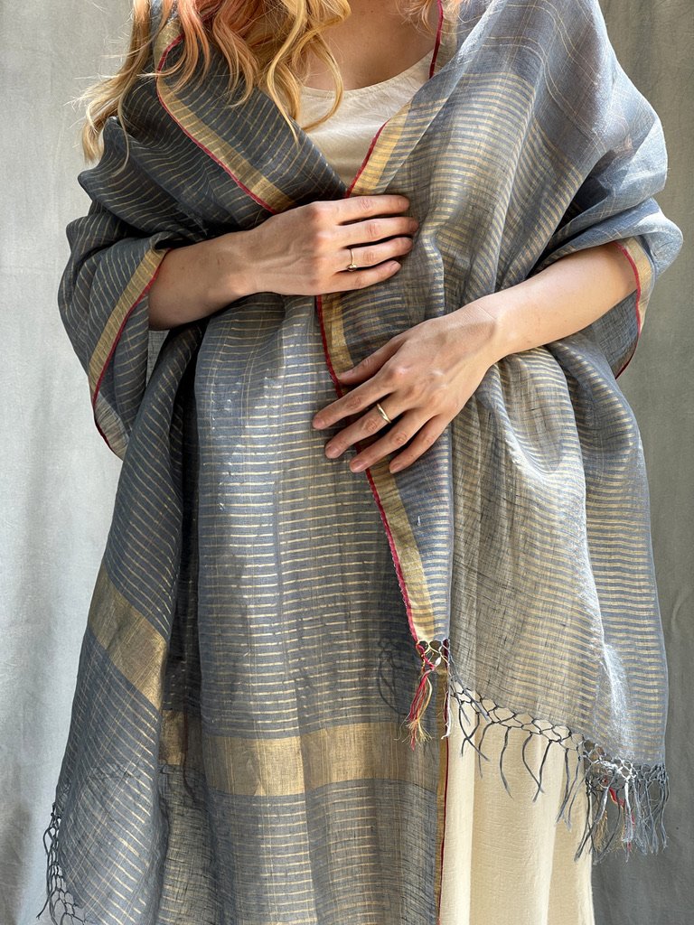 Photographs don’t do justice to these wild silk, handwoven scarves. Available in a selection of lustrous two-tone colourways which change with the light. Only organic silk has this exquisite appearance and texture which can never be replicated by manmade fabrics. A 100% eco product where only natural or Azo-free dyes are used for colouring. Our partners are a fair-trade business giving employment to many weavers, dyers, and handloomers in rural villages thus not only providing them with an income but keeping local traditions alive. These are fabulous worn as a wrap for a ‘dressy’ occasion, but equally happy to be worn more casually.